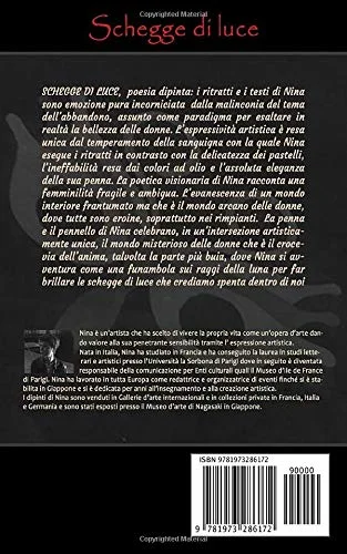 SCHEGGE DI LUCE, poesia dipinta: i ritratti e i testi di Nina sono emozione pura incorniciata dalla malinconia del tema dell*abbandono, assunto come paradigma per esaltare in realt角 la bellezza delle donne. L*espressivit角 artistica 豕 resa unica dal temperamento della sanguigna con la quale Nina esegue i ritratti in contrasto con la delicatezza dei pastelli, l*ineffabilit角 resa dai colori ad olio e l*assoluta eleganza della sua penna. La poetica visionaria di Nina racconta una femminilit角 fragile e ambigua. L*evanescenza di un mondo interiore frantumato ma che 豕 il mondo arcano delle donne, dove tutte sono eroine, soprattutto nei rimpianti. La penna e il pennello di Nina celebrano, in un*intersezione artisticamente unica, il mondo misterioso delle donne che 豕 il crocevia dell*anima, talvolta la parte pi迄 buia, dove Nina si avventura come una funambola sui raggi della luna per far brillare le schegge di luce che crediamo spenta dentro di noi.