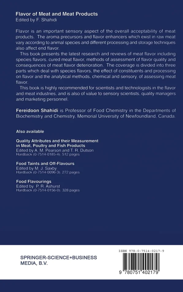 Flavour is an important sensory aspect of the overall acceptability of meat products. Raw meat has a large number of aroma precursors and flavour enhancers which vary according to animal species. This book focuses on the subject of the flavour of meat and meat products.