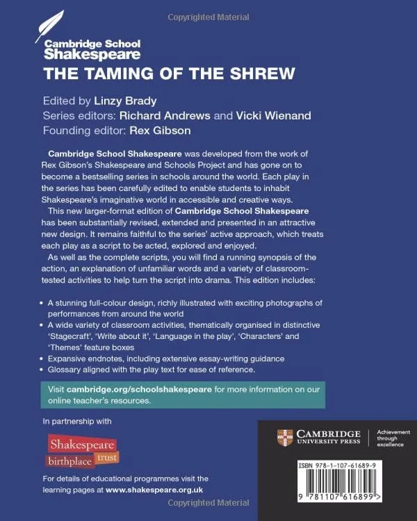 An improved, larger-format edition of the Cambridge School Shakespeare plays, extensively rewritten, expanded and produced in an attractive new design. An active approach to classroom Shakespeare enables students to inhabit Shakespeare’s imaginative world in accessible and creative ways. Students are encouraged to share Shakespeare’s love of language, interest in character and sense of theatre. Substantially revised and extended, classroom activities are thematically organised in distinctive ‘Stagecraft’, ‘Write about it’, ‘Language in the play’, ‘Characters’ and ‘Themes’ features. Extended glossaries are aligned with the play text for easy reference. Expanded endnotes include extensive essay-writing guidance for ‘The Taming of the Shrew’ and Shakespeare. Includes rich, exciting colour photos of performances of ‘The Taming of the Shrew’ from around the world.
