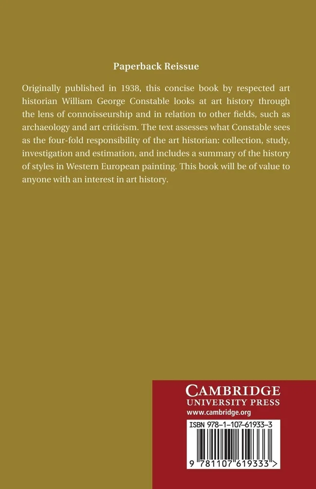 Originally published in 1938, this concise book by respected art historian William George Constable looks at art history through the lens of connoisseurship and in relation to other fields, such as archaeology and art criticism. The text assesses what Constable sees as the four-fold responsibility of the art historian: collection, study, investigation and estimation, and includes a summary of the history of styles in Western European painting. This book will be of value to anyone with an interest in art history.