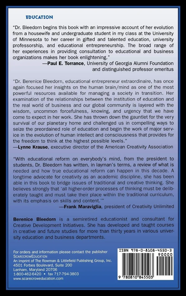 The need for new thinking in the world, both official leadership and for all participating members of society has been a glaring reality in recent times. To Berenice Bleedorn, the idea of teaching students how to use the full potential of their thinking apparatus is not absurd_simply logical and timely. Creative expression is central to the development of a sense of personal identity and it is significant that creative thinking and expression are valued by the powers that be. Each of the 12 chapters discuss creative and other higher order thinking processes as suggested by the products dimension of the Guilford Model of the Structure of Intellect. Included are references to systemic thinking, global dimensionalities, futuristic or visionary thinking, and the need for leadership with capacities to engage in thinking at those higher levels of complexity. An effort is made throughout the articles to heighten awareness of Creative Studies as a substantive area of study with serious relevance to intellectual and personal development across disciplines. This book is helpful for higher education faculty and administrators and consultants and seminar facilitators in creativity and innovation for business, as well as a broad range of organizations and public service centers.