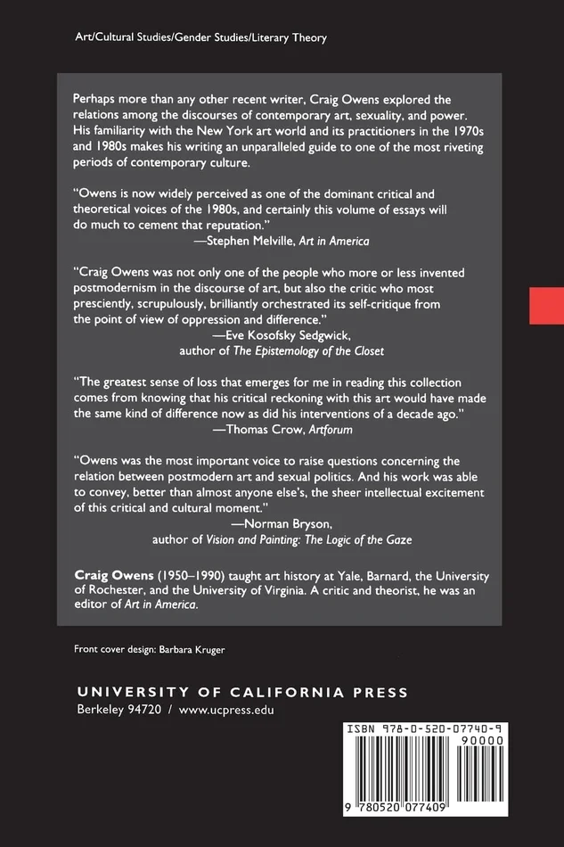 Perhaps more than any other recent writer, Craig Owens explored the relations among the discourses of contemporary art, sexuality, and power. His familiarity with the New York art world and its practitioners in the 1970’s and 1980’s makes his writing an unparalleled guide to one of the most riveting periods of contemporary culture.