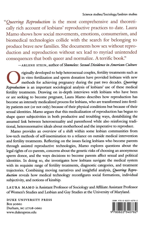Mamo provides an overview of a shift within some lesbian communities from low-tech methods of self-insemination to a reliance on outside medical intervention and fertility treatments. Reflecting on the issues facing lesbians who become parents through assisted reproductive technologies, Mamo explores questions about the legal rights of co-parents, concerns about the genetic risks of choosing an anonymous sperm donor, and the ways decisions to become parents affect sexual and political identities. In doing so, she investigates how lesbians navigate the medical system with its requisite range of fertility treatments, diagnostic categories, and treatment trajectories. Combining moving narratives and insightful analysis,