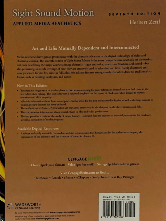 Media aesthetics have gained prominence with the dramatic advances in the digital technology of video and electronic cinema, making Herb Zettl’s SIGHT SOUND MOTION: APPLIED MEDIA AESTHETICS more applicable than ever. The seventh edition of SIGHT SOUND MOTION continues to be the most comprehensive book on the market, not only describing the major aesthetic image elements–light and color, space, time-motion, and sound–but also presenting in-depth coverage on how they are creatively used in television and film. Zettl’s thorough coverage of aesthetic theory and the application of that theory place this contemporary and highly relevant text in a class by itself. Richly illustrated and now presented for the first time in full color, this edition features strong visuals that often draw on traditional art forms, such as painting, sculpture, and dance.