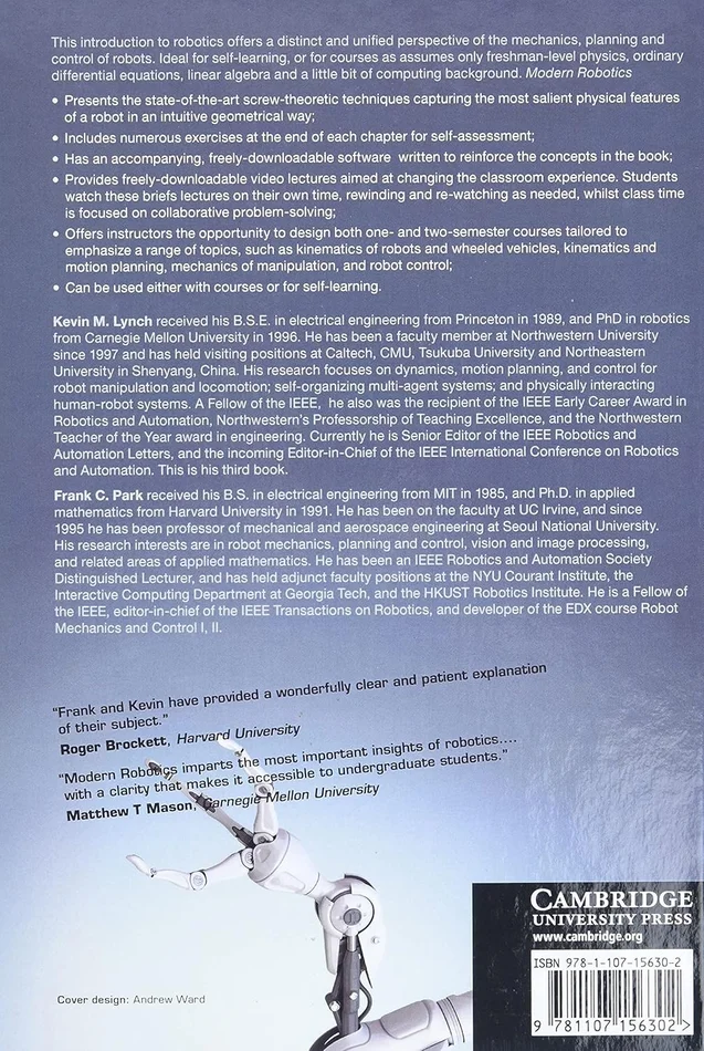 This introduction to robotics offers a distinct and unified perspective of the mechanics, planning and control of robots. Ideal for self-learning, or for courses, as it assumes only freshman-level physics, ordinary differential equations, linear algebra and a little bit of computing background. Modern Robotics presents the state-of-the-art, screw-theoretic techniques capturing the most salient physical features of a robot in an intuitive geometrical way. With numerous exercises at the end of each chapter, accompanying software written to reinforce the concepts in the book and video lectures aimed at changing the classroom experience, this is the go-to textbook for learning about this fascinating subject.