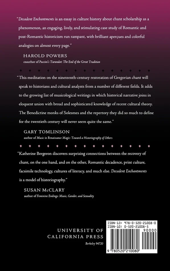 The oldest written tradition of European music, the art we know as Gregorian chant, is seen from an entirely new perspective in Katherine Bergeron’s engaging and literate study. Bergeron traces the history of the Gregorian revival from its Romantic origins in a community of French monks at Solesmes, whose founder hoped to rebuild the moral foundation of French culture on the ruins of the Benedictine order. She draws out the parallels between this longing for a lost liturgy and the postrevolutionary quest for lost monuments that fueled the French Gothic revival, a quest that produced the modern concept of “restoration.”