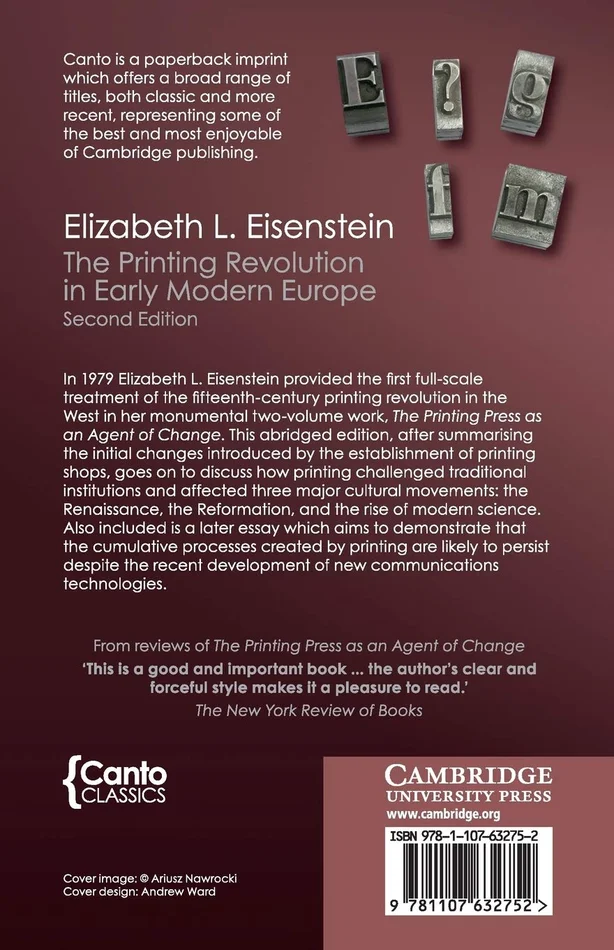 In 1979 Elizabeth Eisenstein provided the first full-scale treatment of the fifteenth-century printing revolution in the West in her monumental two-volume work, The Printing Press as an Agent of Change. This abridged edition, after summarising the initial changes introduced by the establishment of printing shops, goes on to discuss how printing challenged traditional institutions and affected three major cultural movements: the Renaissance, the Reformation, and the rise of modern science. Also included is a later essay which aims to demonstrate that the cumulative processes created by printing are likely to persist despite the recent development of new communications technologies.