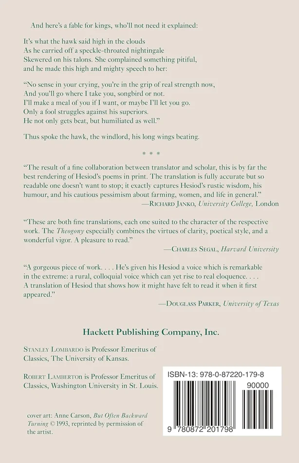 “Robert Lamberton’s Introduction is an excellent, concise exposition of current scholarly debate: his notes are informative and helpful. . . . Those who want a translation that captures something of the spirit of an ancient Greek poetic voice and its cultural milieu and transmits it in an appealing, lively, and accessible style will now turn to Lombardo.” –M. A. Katz, Wesleyan University, in