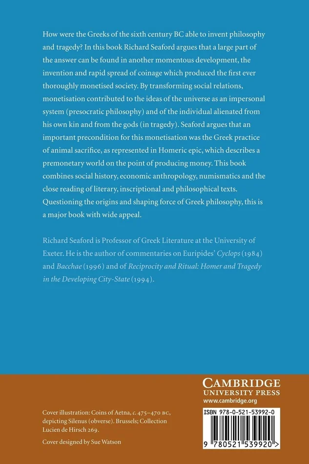 How were the Greeks of the sixth century BC able to invent philosophy and tragedy? Richard Seaford argues that a large part of the answer can be found in another momentous development, the invention and rapid spread of coinage. By transforming social relations, monetization contributed to the concepts of the universe as an impersonal system (fundamental to Presocratic philosophy) and of the individual alienated from his own kin and from the gods, as found in tragedy.