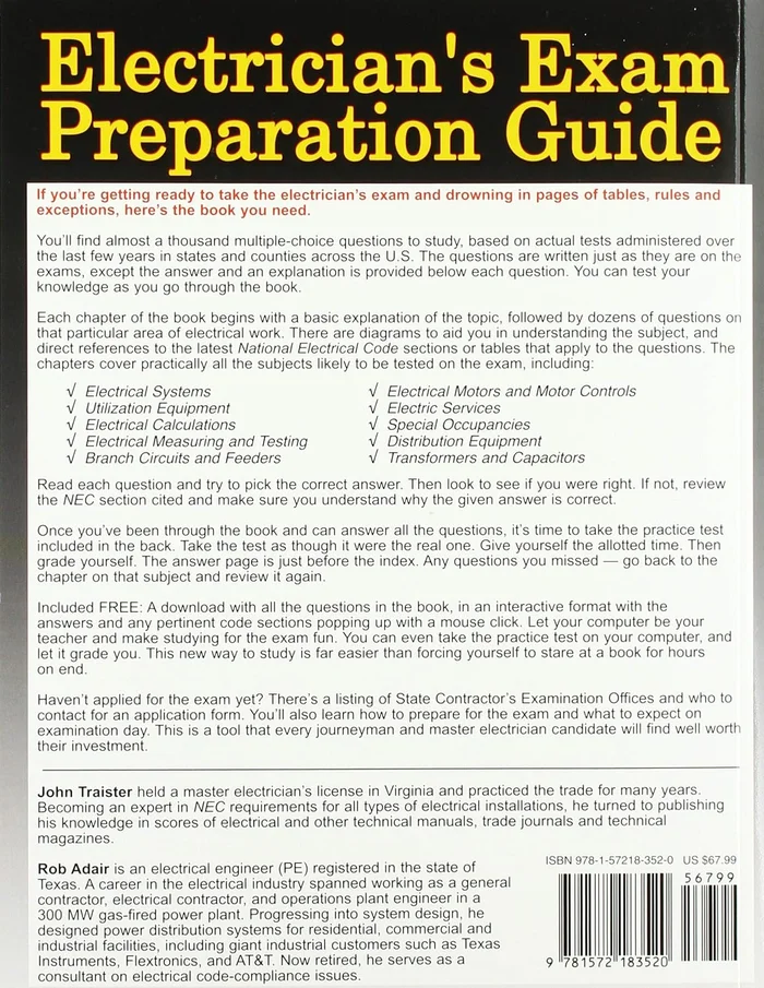 Almost a thousand multiple-choice questions — exactly the type you’ll find on the exam — cover every area of electrical installation: electrical drawings, services and systems, transformers, capacitors, distribution equipment, branch circuits, feeders, calculations, measuring and testing, and more. It gives you the correct answer, an explanation, and where to find it in the latest NEC. Also tells how to apply for the test, where to get your application form, how best to study, and what to expect on examination day.