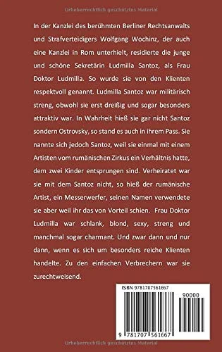 In der Kanzlei des ber邦hmten Berliner Rechtsanwalts und Strafverteidigers Wolfgang Wochinz, genannt WoWo, der auch eine Kanzlei in Rom unterhielt, residierte die junge und sch?ne Sekret?rin Ludmilla Santoz, als Frau Doktor Ludmilla. So wurde sie von den Klienten respektvoll genannt. Ludmilla Santoz war milit?risch streng, obwohl sie erst Anfang drei?ig und sogar besonders attraktiv war. In Wahrheit hie? sie gar nicht Santoz sondern Ostrovsky, so stand es auch in ihrem Pass. Sie nannte sich jedoch Santoz, weil sie einmal mit einem Artisten vom rum?nischen Zirkus ein Verh?ltnis hatte, dem zwei Kinder entsprungen sind. Verheiratet war sie mit dem Santoz nicht, so hie? der rum?nische Artist, ein Messerwerfer, seinen Namen verwendete sie aber weil ihr das von Vorteil schien. Auch der Artist hie? nicht Santoz sondern Popescu, aber er fand Santoz besonders gut zu einem Messerwerfer passend. Frau Doktor Ludmilla war schlank, blond, sexy, streng, zurechtweisend und manchmal sogar charmant. Und zwar dann und nur dann, wenn es sich um besonders reiche Klienten handelte. Zu den einfachen Verbrechern, den R?uber, M?rdern, Kindsverderbern und Betr邦gern war sie streng. Jeder der Klienten musste Frau Doktor zu ihr sagen, obwohl ※Frau Doktor§ niemals eine Hochschule von innen gesehen, geschweige denn studiert hatte. Die Reichen aber durften sie gar Frau Doktor Lilly nennen. Lilly war nicht aus besseren oder auch nur soliden Verh?ltnissen, nein, sie war ein Stra?enkind aus Rum?nien, irgendwo in Siebenb邦rgen, weshalb sie neben rum?nisch und italienisch auch Deutsch konnte – und beides sogar ausgezeichnet – was ihr sp?ter den Posten beim Berliner Anwalt einbrachte, denn Wochinz konnte Sie somit in Berlin, wie auch in Rom einsetzen. Au?erdem machte sie auf jedermann den Eindruck h?herer Bildung.