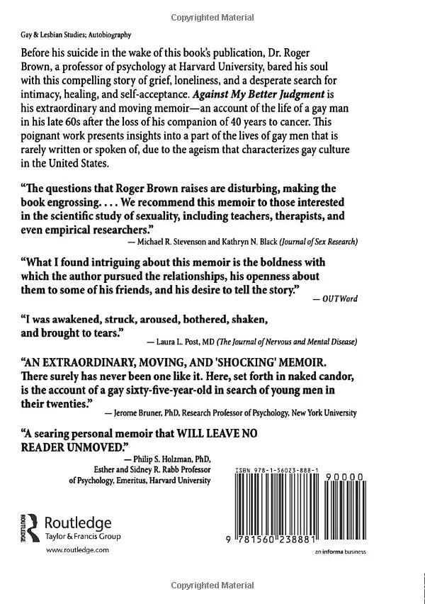 Against My Better Judgment: An Intimate Memoir of an Eminent Gay Psychologist is an extraordinary and moving account of the life of a gay man in his late 60s after he loses his companion of 40 years to cancer. A leading professor of psychology at Harvard University, Roger Brown bravely comes forth with his compelling story of grief, loneliness, and a relentless search for intimacy, healing, and self-acceptance. Readers gain insight into a stage of life experienced by gay men of which little is written or spoken due to the ageism that characterizes homosexual culture. Against My Better Judgment reveals deeply personal truths that will prepare gay men for what to expect in the later stages of life. Universal in nature, these truths will speak to readers from various lifestyles and of all ages. Readers will recognize the book as a story of looking for love in all the wrong places, but will also see in it a process of discovery–both internal and external. In the aftermath of his lover*s death, Brown turns to prostitutes for companionship, for relieving repressed sexual energy, and even for love. Through his unique relationships with three young men, he does not find the romantic love he so desperately seeks, but discovers that his idea of human nature has been formed by his particular life position and association with people who share his values, knowledge, and privileges. Once he goes outside his social and intellectual circle, he acquires a new perspective on life and realizes how far from universal truth his notions of humanity have been.Readers of Against My Better Judgment will gain a different perspective on the complexities of love, relationships, fidelity, human nature, and the hardships of life inevitably faced by all humans–straight, gay, or bisexual. Gay men, lesbians, psychologists, widowers, therapists, and anthropologists, as well as sensitive readers of any background, will heighten their understanding of what it means to be human. This remarkable story makes a tremendous contribution to existing gay literature and the timeless struggle of art and literature to make sense of the universe and the place of humans within it. Echoing life, Against My Better Judgment, with its brutal honesty, intrigues and repels alternately, just as it elicits both sadness and laughter.