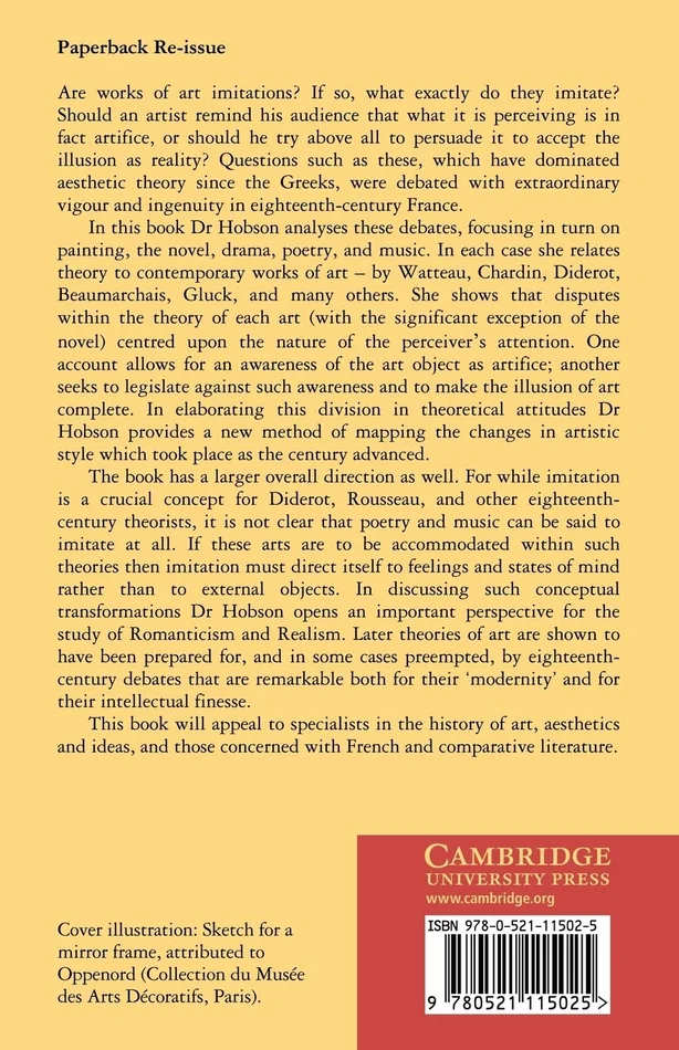 Are works of art imitations? If so, what exactly do they imitate? Should an artist remind his audience that what it is perceiving is in fact artifice, or should he try above all to persuade it to accept the illusion as reality? Questions such as these, which have dominated aesthetic theory since the Greeks, were debated with extraordinary vigour and ingenuity in eighteenth-century France. In this book Dr Hobson analyses these debates, focusing in turn on painting, the novel, drama, poetry and music. In each case she relates theory to contemporary works of art by Watteau, Chardin, Diderot, Beaumarchais, Gluck and many others. She shows that disputes within the theory of each art centred upon the nature of the perceiver’s attention. Dr Hobson provides a method of mapping the changes in artistic style which took place as the century advanced. In discussing such conceptual transformations Dr Hobson opens an important perspective for the study of Romanticism and Realism.