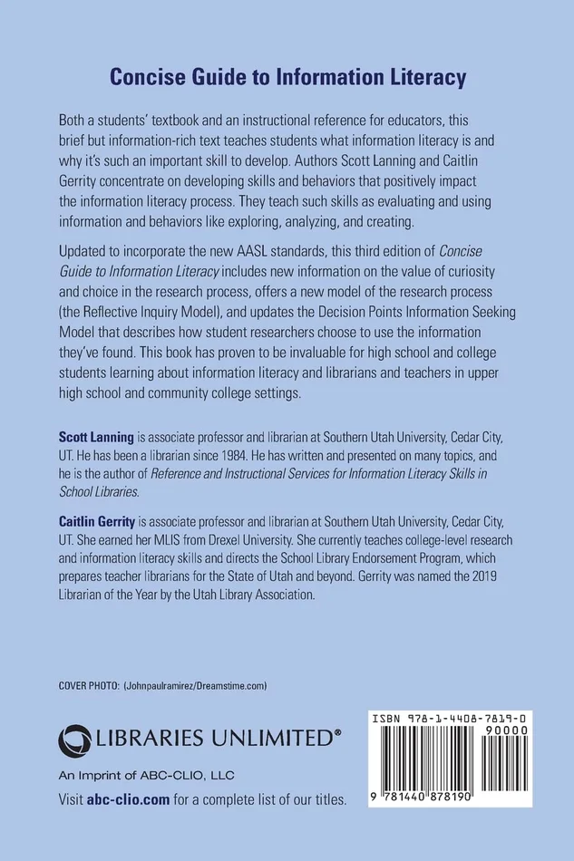 Both a students’ textbook and an instructional reference for educators, this brief but information-rich text teaches students what information literacy is and why it’s such an important skill to develop. Authors Scott Lanning and Caitlin Gerrity concentrate on developing skills and behaviors that positively impact the information literacy process. They teach such skills as evaluating and using information and behaviors like exploring, analyzing, and creating.