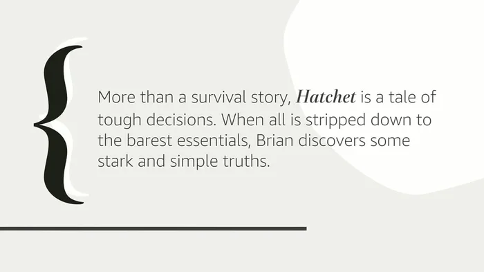 Thirteen-year-old Brian Robeson, haunted by his secret knowledge of his mother*s infidelity, is traveling by single-engine plane to visit his father for the first time since the divorce. When the plane crashes, killing the pilot, the sole survivor is Brian. He is alone in the Canadian wilderness with nothing but his clothing, a tattered windbreaker, and the hatchet his mother had given him as a present.