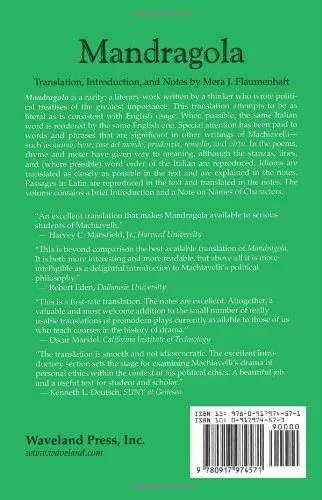 A superior treatment of Machiavelli’s minor masterpiece! Flaumenhaft’s beautifully crafted, literal translation aims to capture the original intent of the playwright. Machiavelli himself distinguished carefully between translations and revisions; thus, Flaumenhaft finds a faithful translation essential to conveying Machiavelli’s thought and to allowing direct access to the work. The Prologue explores the relationship between Machiavelli’s stage comedies–part of the Comedia Erudita of the Italian Renaissance–and his political books. Mandragola focuses on the interplay between personal and political ethics, a major theme throughout his works. The translation includes helpful notes that clarify allusions, language, and context. Names of characters and places, titles and forms of address, and some familiar Italian words and phrases remain in Italian. Passages in Latin, as well as idioms, are reproduced in the notes.