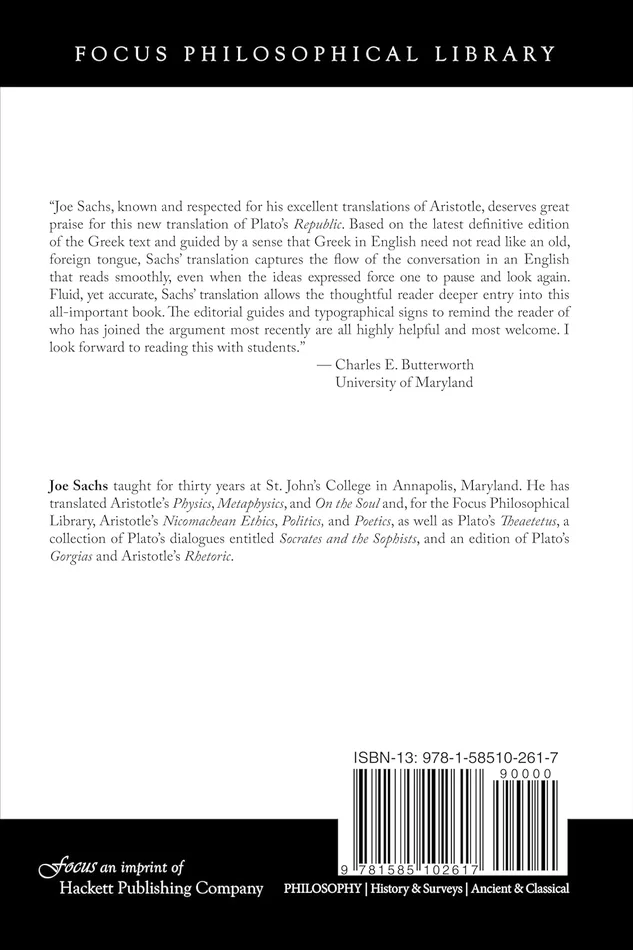 is an English translation of one of the most intellectually important works in Western philosophy and political theory. It includes an extensive introduction, an extensive afterword “Imitation” by John White, a chapter-by-chapter outline of principal speakers and summary of the content, Stephanus numbers, boldface type to indicate the entrance of a new speaker into the discussion, footnotes, and glossary of key terms with cross-references for the text.