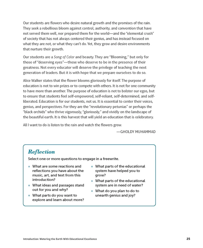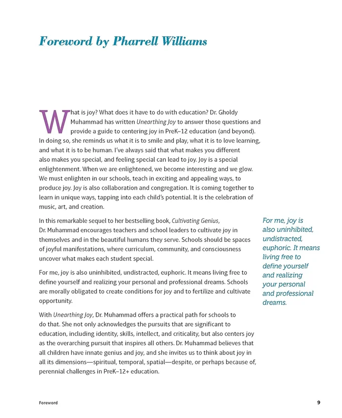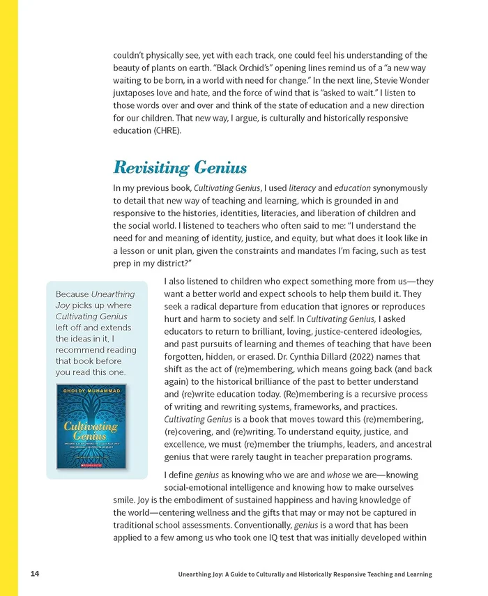 In this follow-up to Cultivating Genius, Dr. Gholdy Muhammad adds a fifth pursuit求joy求to her groundbreaking instructional model. She defines joy as more than celebration and happiness, but also as wellness, beauty, healing, and justice for oneself and across humanity. She shows how teaching from cultural and historical realities can enhance our efforts to cultivate identity, skills, intellect, criticality, and-indeed-joy for all students, giving them a powerful purpose to learn and contribute to the world. Dr. Muhammad’s wise implementation advice is paired with model lessons and assessment tools that span subjects and grade levels.