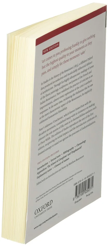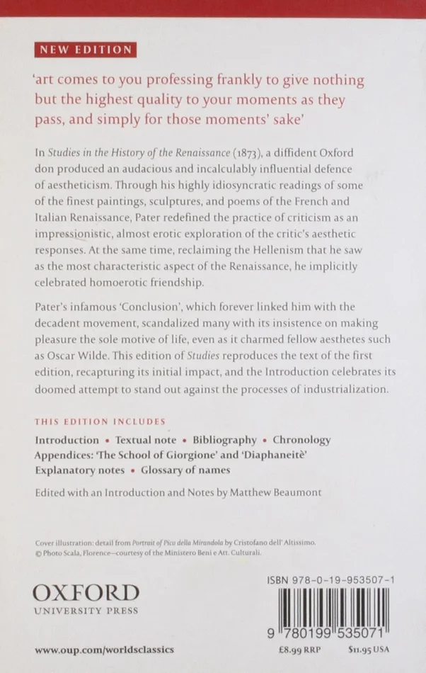 reproduces the text of the first edition of 1873. Matthew Beaumont’s Introduction describes the cultural context that gave rise to the book, the reasons for its notoriety, Pater’s philosophical outlook, and the arguments in his book. It explores Pater’s work as an attempt to preserve the unique aesthetic of a work of art in the face of encroaching mass culture. The book also includes the later chapter on Giorgione as an Appendix, comprehensive notes that identify the many literary and artistic references, and a useful glossary of names.