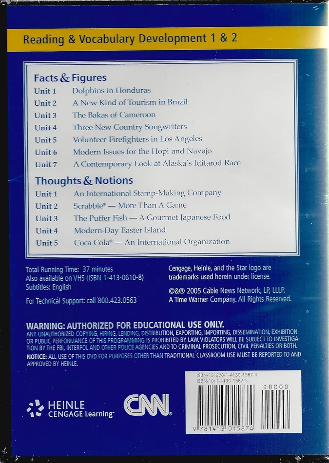 In conjunction with CNN, Facts & Figures, 4th Edition and Thoughts & Notions, 2nd edition are supported by a supplementary video component for each unit. The FACTS & FIGURES, 4TH EDITION programs include: Unit 1: Dolphins in Honduras; Unit 2: A New Kind of Tourism in Brazil; Unit 3: The Bakas of Cameroon; Unit 4: Three New Country Songwriters; Unit 5: Volunteer Firefighters in Los Angeles; Unit 6: Modern Issues for Hopi and Navajo; and Unit 7: A Contemporary Look at Alaska’s Iditarod Race. The THOUGHTS & NOTIONS, 2ND EDITION programs include: Unit 1: An International Stamp-Making Company; Unit 2: Scrabble — More Than a Game; Unit 3: The Puffer Fish — A Gourmet Japanese Food; Unit 4: Modern-Day Easter Island; and Unit 5: Coca Cola — An International Organization.