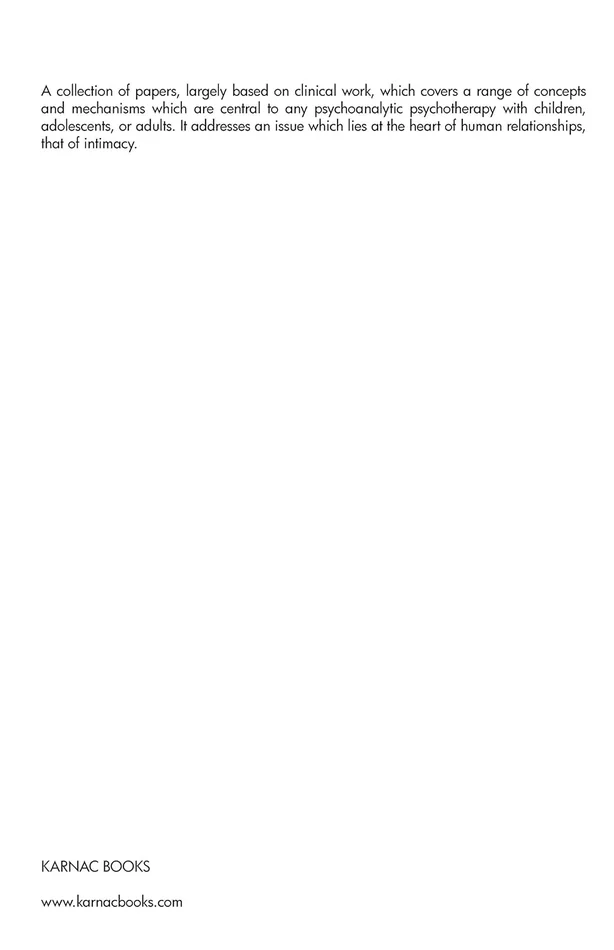 A collection of papers, largely based on clinical work, which covers a range of concepts and mechanisms which are central to any psychoanalytic psychotherapy with children, adolescents, or adults. It addresses an issue which lies at the heart of human relationships, that of intimacy.