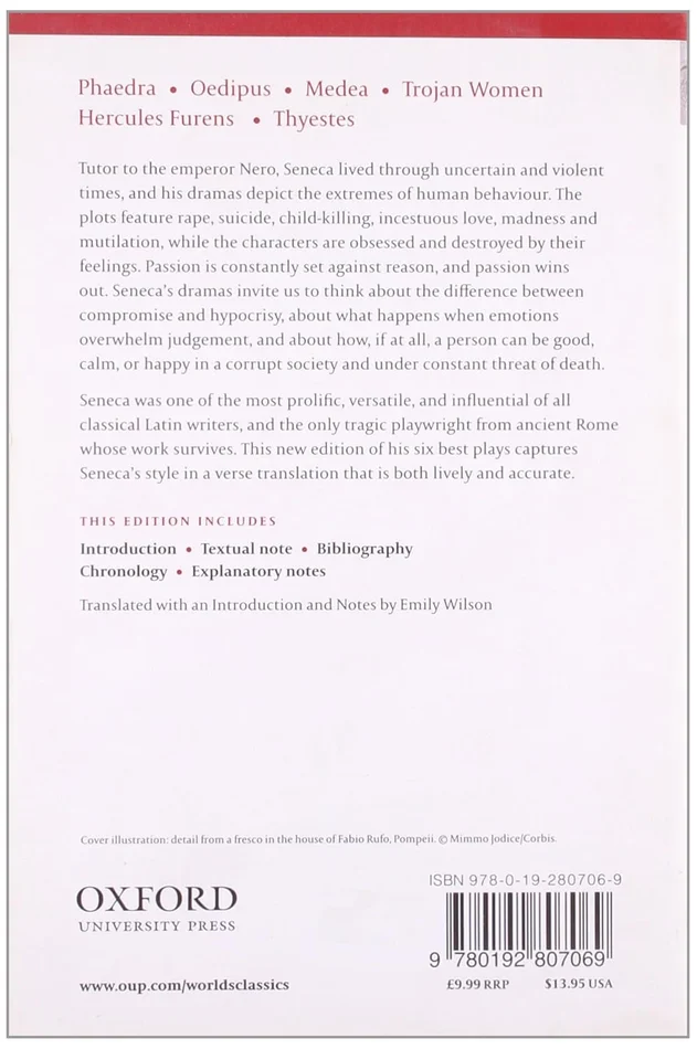 Here is a lively, readable, and accurate verse translation of the six best plays by one of the most influential of all classical Latin writers–the only tragic playwright from ancient Rome whose work survives. Tutor to the emperor Nero, Seneca lived through uncertain, oppressive, and violent times, and his dramas depict the extremes of human behavior. Rape, suicide, child-murder, incestuous love, madness, and mutilation afflict the characters, who are obsessed and destroyed by their feelings. Seneca forces us to think about the difference between compromise and hypocrisy, about what happens when emotions overwhelm judgment, and about how a person can be good, calm, or happy in a corrupt society and under constant threat of death. In addition to her superb translation, Emily Wilson provides an invaluable introduction which offers a succinct account of Seneca’s life and times, his philosophical beliefs, the literary form of the plays, and their immense influence on European literature. The book also includes an up-to-date bibliography and explanatory notes which identify mythological allusions.