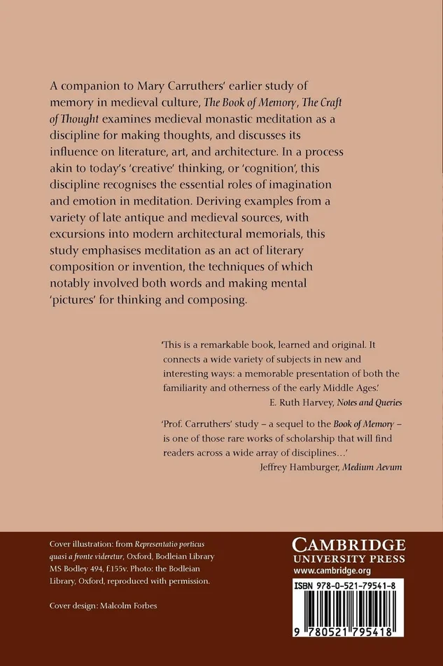 A companion to Mary Carruthers’ earlier study of memory in medieval culture, The Book of Memory, this book, The Craft of Thought, examines medieval monastic meditation as a discipline for making thoughts, and discusses its influence on literature, art, and architecture, deriving examples from a variety of late antique and medieval sources, with excursions into modern architectural memorials. The study emphasizes meditation as an act of literary composition or invention, the techniques of which notably involved both words and making mental “pictures” for thinking and composing.