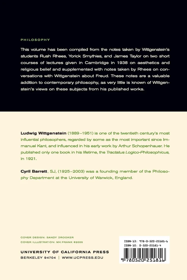 In 1938 Wittgenstein delivered a short course of lectures on aesthetics to a small group of students at Cambridge. The present volume has been compiled from notes taken down at the time by three of the students: Rush Rhees, Yorick Smythies, and James Taylor. They have been supplemented by notes of conversations on Freud (to whom reference was made in the course on aesthetics) between Wittgenstein and Rush Rhees, and by notes of some lectures on religious belief. As very little is known of Wittgenstein’s views on these subjects from his published works, these notes should be of considerable interest to students of contemporary philosophy. Further, their fresh and informal style should recommend Wittgenstein to those who find his