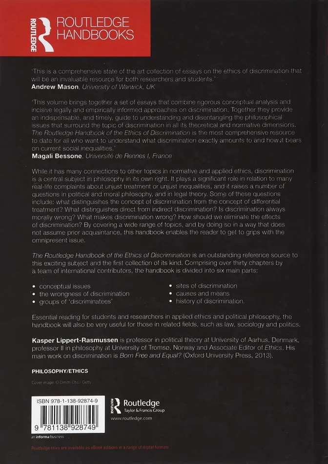 While it has many connections to other topics in normative and applied ethics, discrimination is a central subject in philosophy in its own right. It plays a significant role in relation to many real-life complaints about unjust treatment or unjust inequalities, and it raises a number of questions in political and moral philosophy, and in legal theory. Some of these questions include: what distinguishes the concept of discrimination from the concept of differential treatment? What distinguishes direct from indirect discrimination? Is discrimination always morally wrong? What makes discrimination wrong? How should we eliminate the effects of discrimination? By covering a wide range of topics, and by doing so in a way that does not assume prior acquaintance, this handbook enables the reader to get to grips with the omnipresent issue.