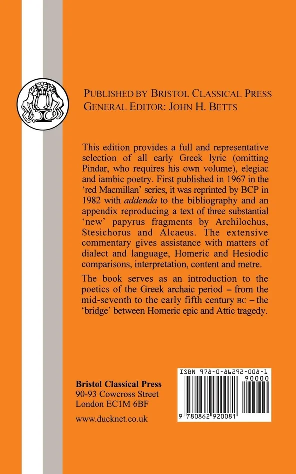 This edition provides a full and representative selection of all early Greek lyric (omitting Pindar, who requires his own volume), elegiac and iambic poetry. First published in 1967 in the ‘red Macmillan’ series, it was reprinted by BCP in 1982 with addenda to the bibliography and an appendix reproducing a text of three substantial ‘new’ papyrus fragments by Archilochus, Stesichorus and Alcaeus. The extensive commentary gives assistance with matters of dialect and language, Homeric and Hesiodic comparisons, interpretation, content and metre. The book serves as an introduction to the poetics of the Greek archaic period – from the mid-seventh to the early fifth century BC – the ‘bridge’ between Homeric epic and Attic tragedy.