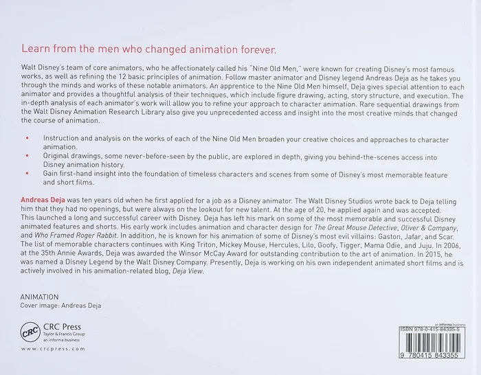 Walt Disney*s team of core animators, who he affectionately called his “Nine Old Men,” were known for creating Disney*s most famous works, as well as refining the 12 basic principles of animation. Follow master animator and Disney legend Andreas Deja as he takes you through the minds and works of these notable animators. An apprentice to the Nine Old Men himself, Deja gives special attention to each animator and provides a thoughtful analysis on their techniques that include figure drawing, acting, story structure, and execution. The in-depth analysis of each animator*s work will allow you to refine your approach to character animation. Rare sequential drawings from the Disney archives also give you unprecedented access and insight into the most creative minds that changed the course of animation.