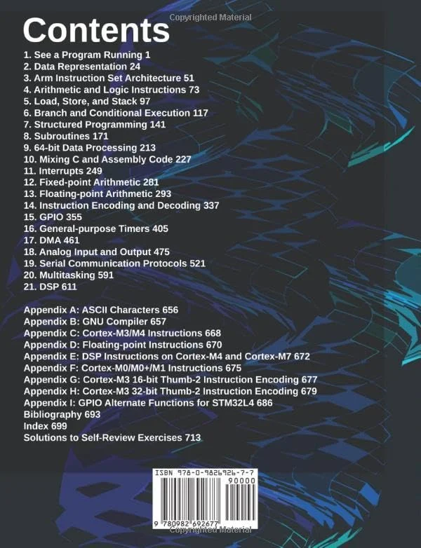 The book introduces basic programming of ARM Cortex-M cores in assembly and C at the register level, and the fundamentals of embedded system design. It presents basic concepts such as data representations (integer, fixed-point, floating-point), assembly instructions, stack, and implementing basic controls and functions of C language at the assembly level. It covers advanced topics such as interrupts, mixing C and assembly, direct memory access (DMA), system timers (SysTick), multi-tasking, SIMD instructions for digital signal processing (DSP), and instruction encoding/decoding. The book also gives detailed examples of interfacing peripherals, such as general purpose I/O (GPIO), LCD driver, keypad interaction, stepper motor control, PWM output, timer input capture, DAC, ADC, real-time clock (RTC), and serial communication (USART, I2C, SPI, and USB).