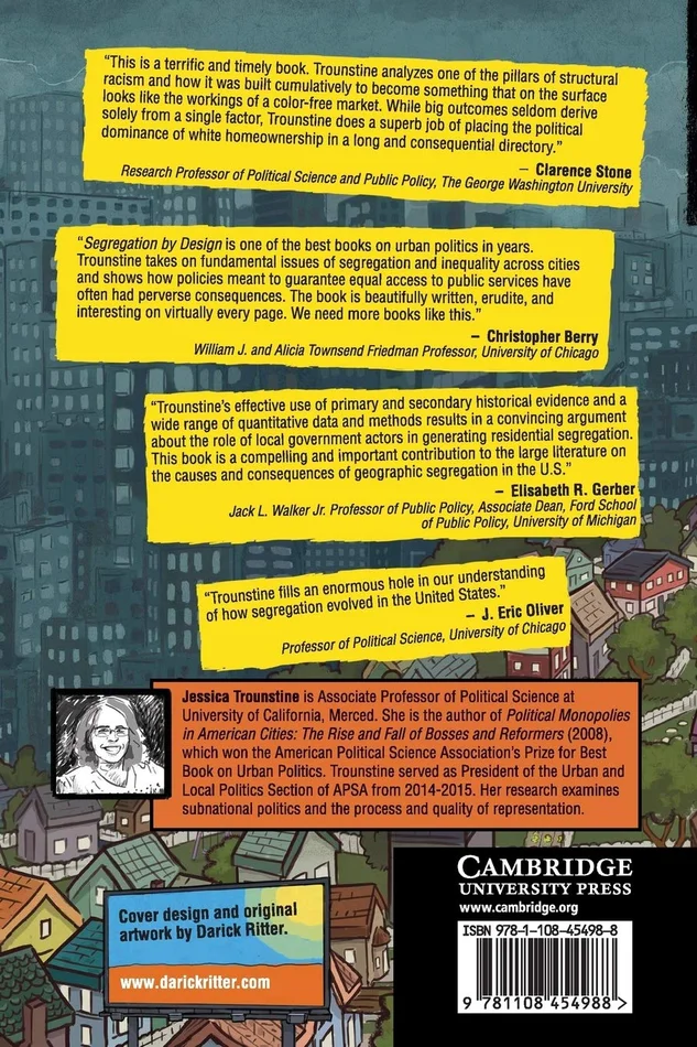 Segregation by Design draws on more than 100 years of quantitative and qualitative data from thousands of American cities to explore how local governments generate race and class segregation. Starting in the early twentieth century, cities have used their power of land use control to determine the location and availability of housing, amenities (such as parks), and negative land uses (such as garbage dumps). The result has been segregation – first within cities and more recently between them. Documenting changing patterns of segregation and their political mechanisms, Trounstine argues that city governments have pursued these policies to enhance the wealth and resources of white property owners at the expense of people of color and the poor. Contrary to leading theories of urban politics, local democracy has not functioned to represent all residents. The result is unequal access to fundamental local services – from schools, to safe neighborhoods, to clean water.