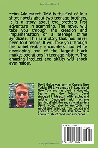An Adolescent DMV is the first of four short novels. It is a story about the adventures of two brothers in scamming. The novel will take you through the creation and implementation of a teenage crime syndicate. This is a story that has never been told before. It will take you through the unbelievable encounters had while developing one of the largest black market operations in teenage history. The amazing intellect and ability will shock ever reader.