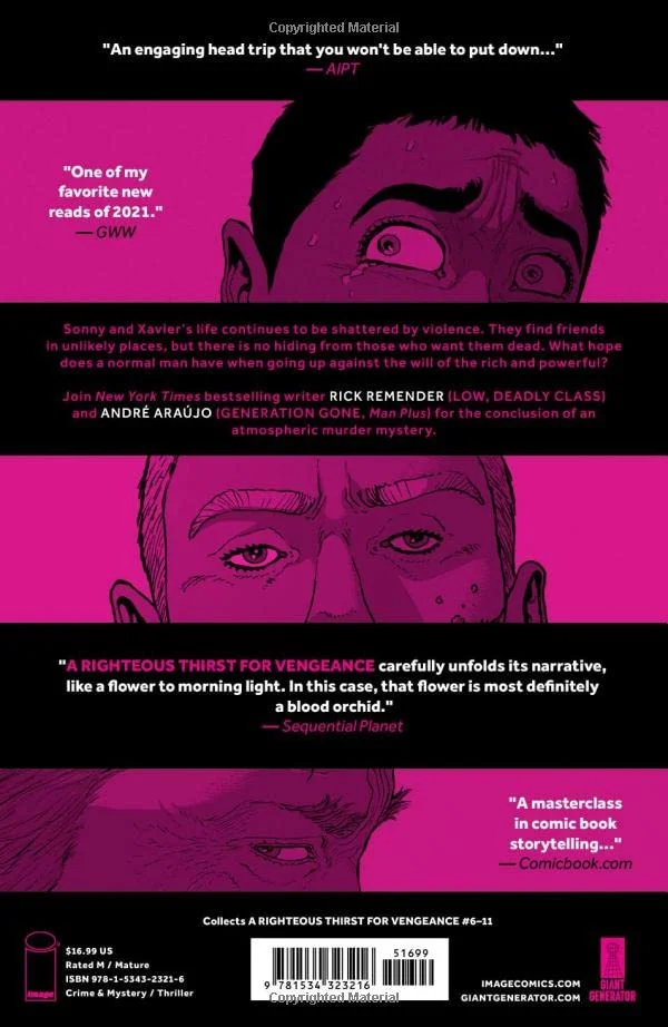 Sonny and Xavier*s life continues to be shattered by violence. They find friends in unlikely places, but there is no hiding from those who want them dead. What hope does a normal man have when going up against the will of the rich and powerful? Join New York Times bestselling writer RICK REMENDER (LOW, DEADLY CLASS) and ANDR谷 ARA迆JO (GENERATION GONE, Man Plus) for the conclusion of an atmospheric murder mystery.